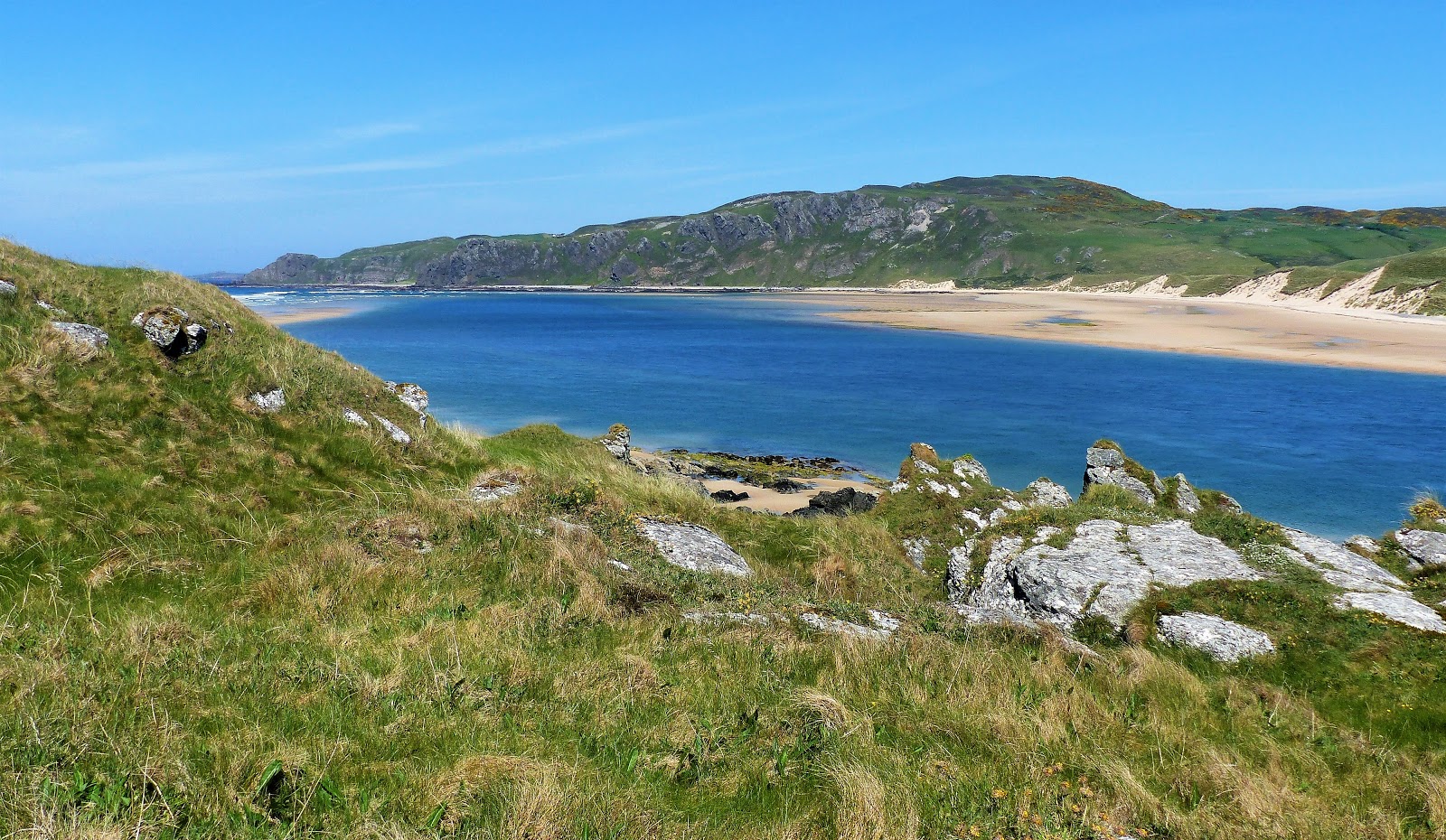 Nous nous dirigeons maintenant vers la péninsule d'Inishowen, dans un paysage qui alternent les landes rocailleuses et les vertes prairies sous un ciel toujours aussi bleu et une température plus qu'agréable avec juste un petit vent océanique pour atténuer la chaleur ! Nous sommes tout de même à la pointe nord-ouest de l'Irlande et nous ne nous attendions pas à bénéficier d'un temps aussi beau à fin Mai !
